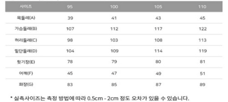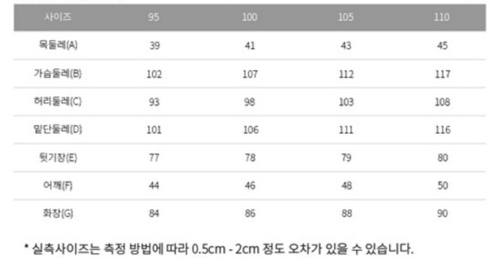 제가 구매한 100 사이즈를 기준으로 보면 레귤러 핏 가슴둘레와 허리둘레가 슬림 핏 제품보다 보다 5cm 크며 슬림 핏 105 사이즈와 같은 걸 볼 수 있는데요.