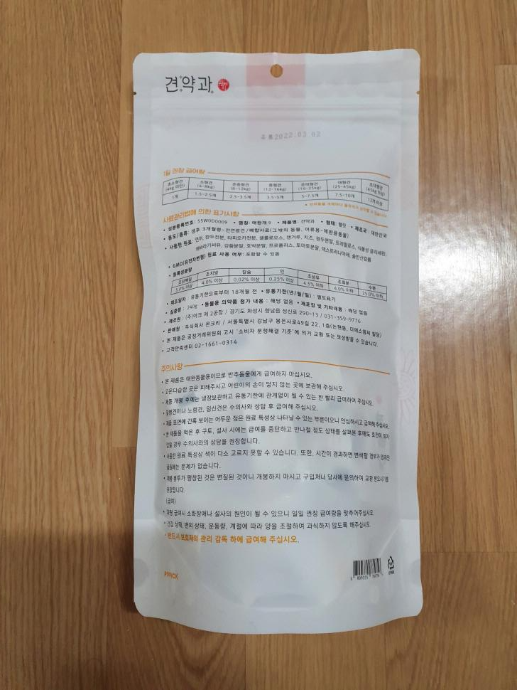 가끔 황태도 없고 야채도 흐물거려서 급여를 못할 때가 있어서 그럴 때 급여할 성분 좋은 간식을 집에 구비해놔야겠다고 느꼈습니다.