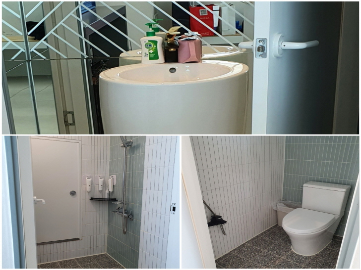 수건은 넉넉하게 8장 정도 있어서 좋았고 옆에 세면대가 있고 세면대 양옆으로 샤워실과 화장실이 있는데 화장실에도 샤워기가 있어 급하다면 동시에 씻을 수도 있습니다.