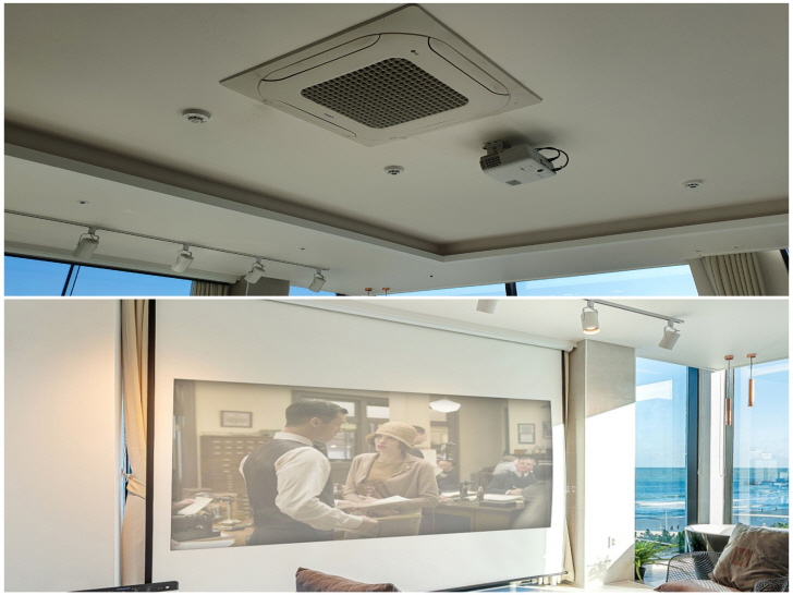 천장에 에어컨과 빔프로젝트가 있고 전면 유리창 앞에 대형 스크린이 있어 침대에 누워서 보기에도 좋았습니다.