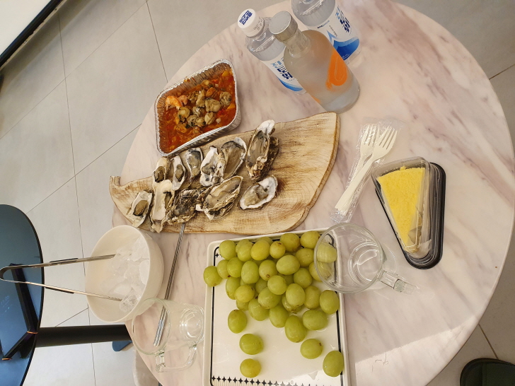 사장님께 혹시 택배를 받아주실수 있냐고 여쭤보니 가능하다고 하셔서 미리 인터넷으로 가리비, 굴, 새우등을 주문해서 풀빌라에서 바로 받았습니다.