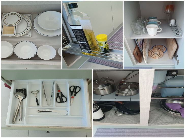 식기도구들이 거의 다 구비되어 있는데 저희는 사용할 거만 꺼내놓고 설거지부터 한번 하고 사용했습니다.